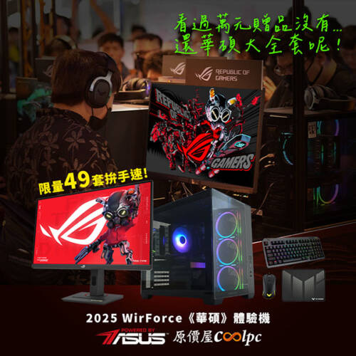 限量 49 套,拚手速了各位!本批《華碩》體驗機在 2025 WirForce 擔綱遊戲體驗主機。搶購再送萬元華碩周邊大全套 (ROG 27″電競螢幕、TUF 機械式鍵盤、滑鼠、滑墊),誠意十足之外,玩起來也夠爽!更重要的是,保固皆從您購買當日起算,絕不縮水!主機從組裝、活動進場、安裝設定、到撤場整理,全程皆由原價屋一條龍包辦,細心呵護每一台屬於您的電腦...     繼續看下去