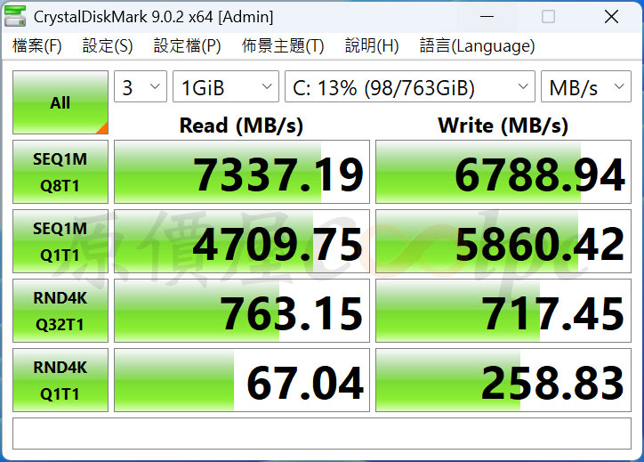 CrystalDiskMark 9.0.2 x64 測速軟體,連續讀寫最高速度 7337/6788 MB/s。