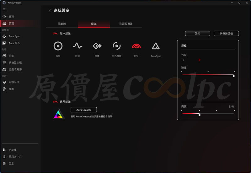 Armoury Crate 軟體整合 GAMING PC 系統即時資訊和 Aura Sync 燈光控制設定,其他還有像是巨集、情境設定檔功能可以使用。
