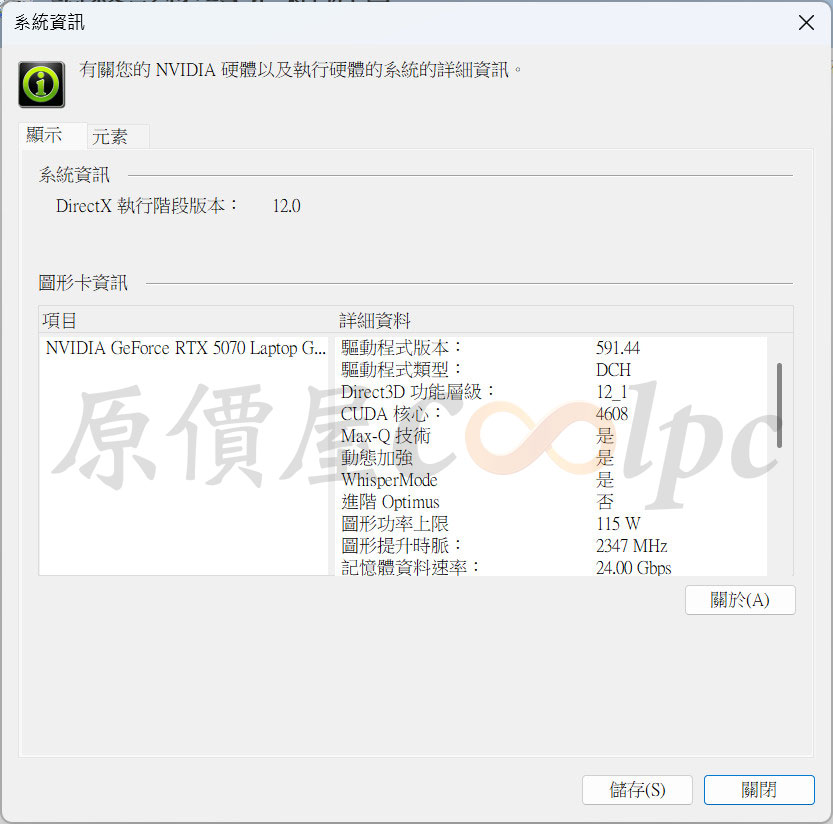 NVIDIA GeForce RTX 5070 Laptop 8GB 獨立顯卡功率上限 100 + 15W Dynamic Boost。