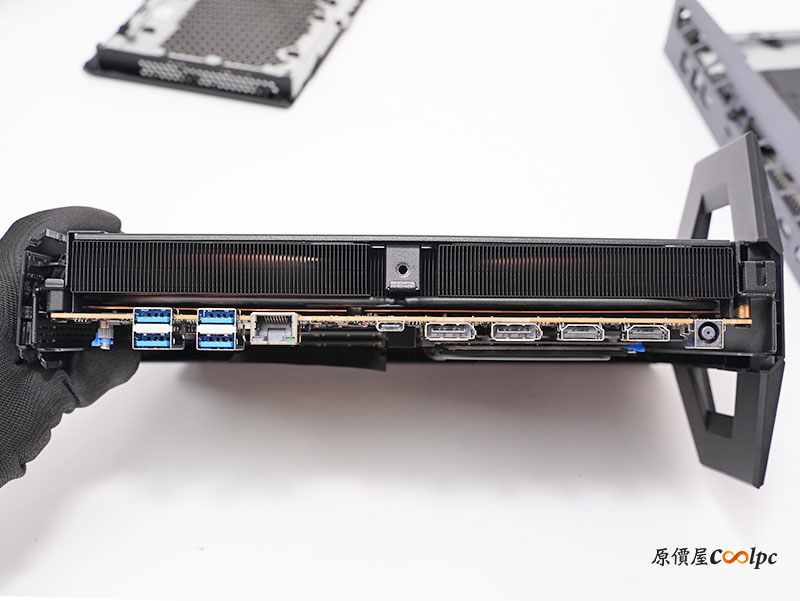 左右兩側除了通風孔之外,左邊是 ROG 字樣,右邊是燻黑透明遮光板,通電還會有 ARGB 燈光效果。