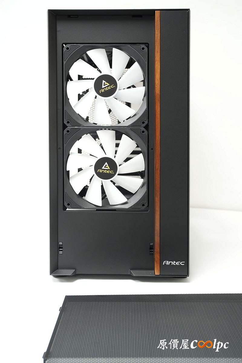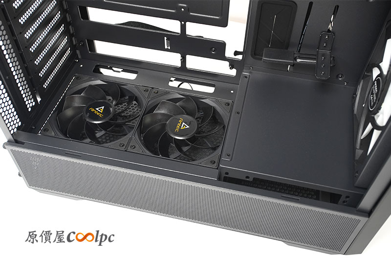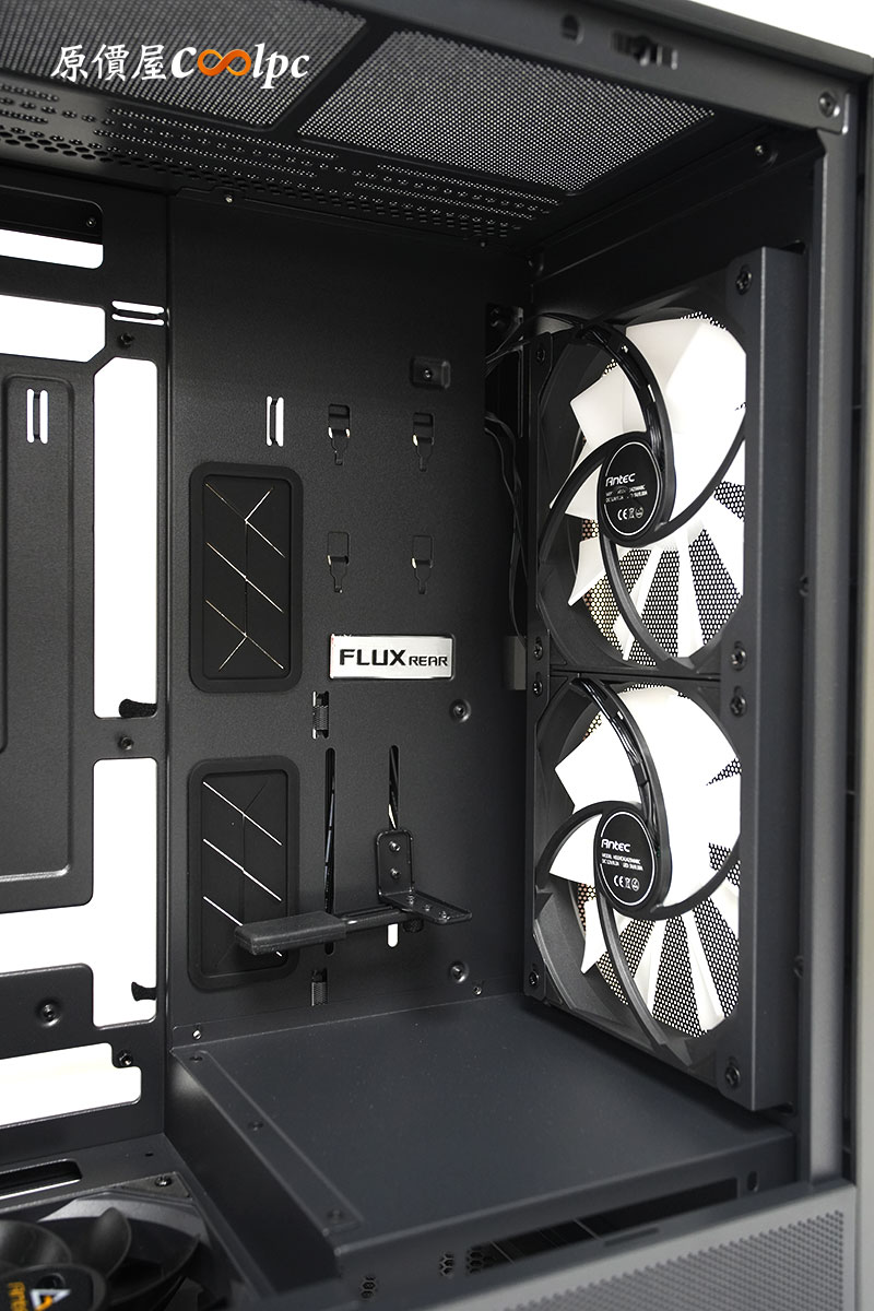「Antec FLUX REAR」在底部也配置了 2 顆 120mm 的反葉片風扇,提供內部更好的散熱循環。