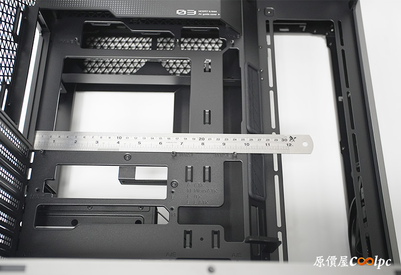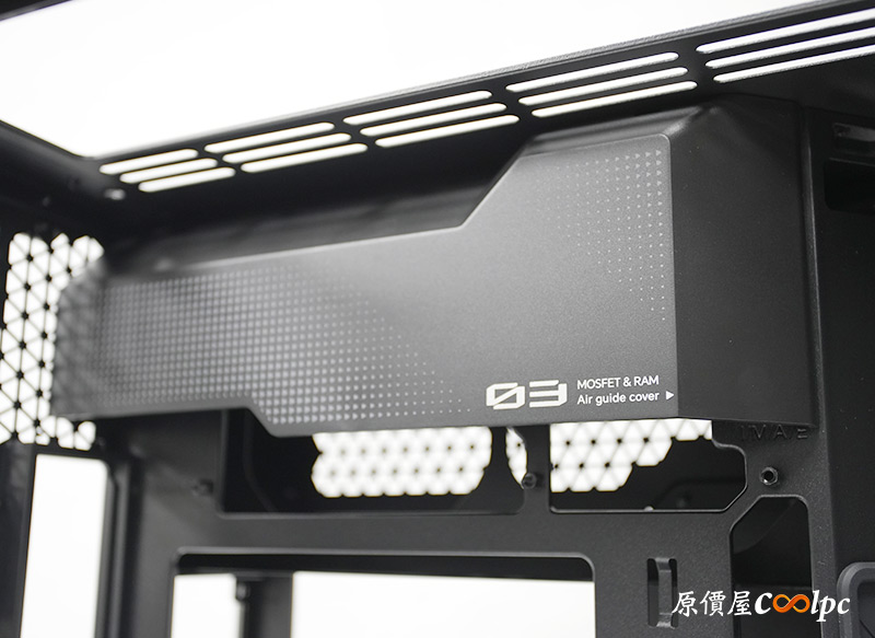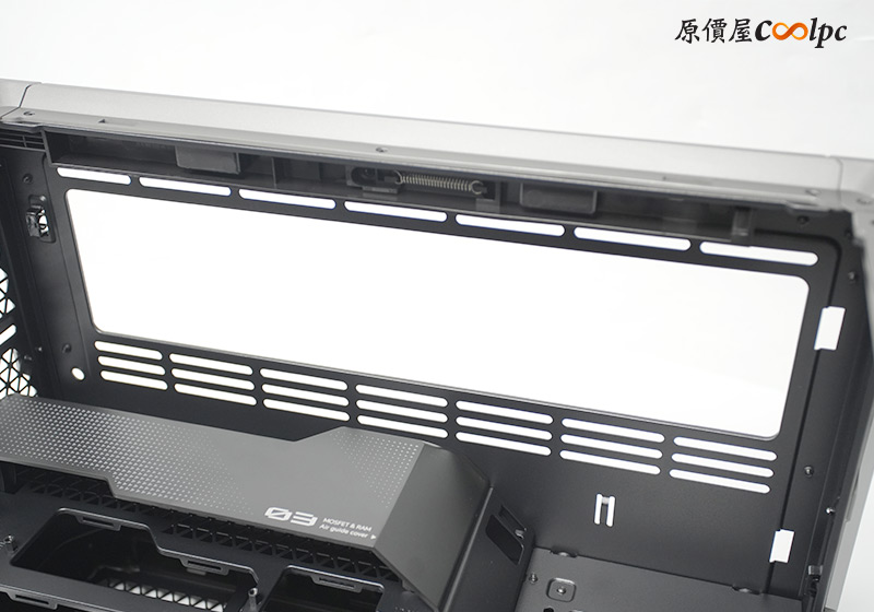 主板上方有一個導流遮罩(可以拆卸),用來輔助主機板供電MOSFET與RAM散熱,而且後方其實還有2個風扇安裝空間,一會兒介紹後艙時會看到。