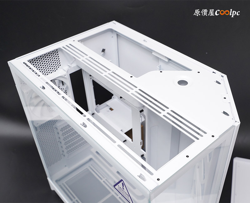 機殼正面前半部是鋼化玻璃,後半段則是斜面網孔進風設計,增加機殼空氣對流。