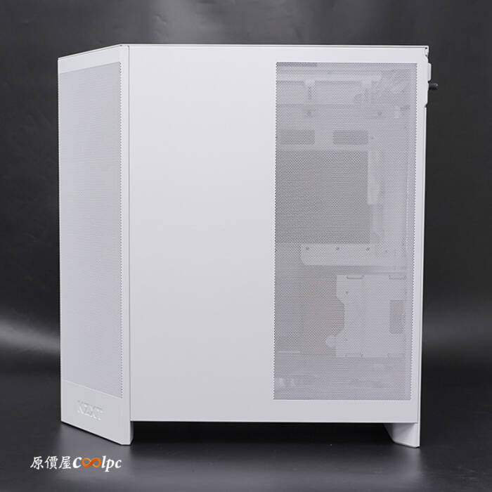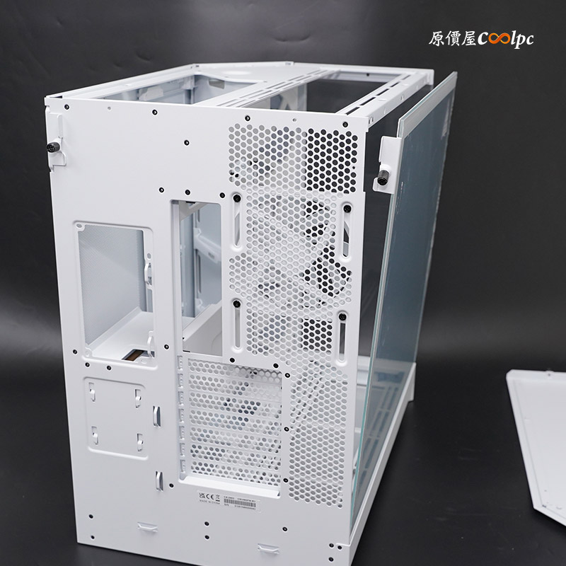機殼正右半邊則是有大量細小的六角通風孔,左邊則是電源供應器和硬碟艙別。