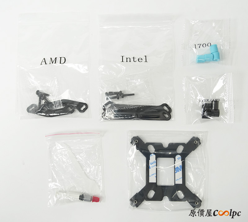 配件包內將Intel & AMD以及不同腳位需要的零件分裝,並附上一小條散熱膏可供使用。