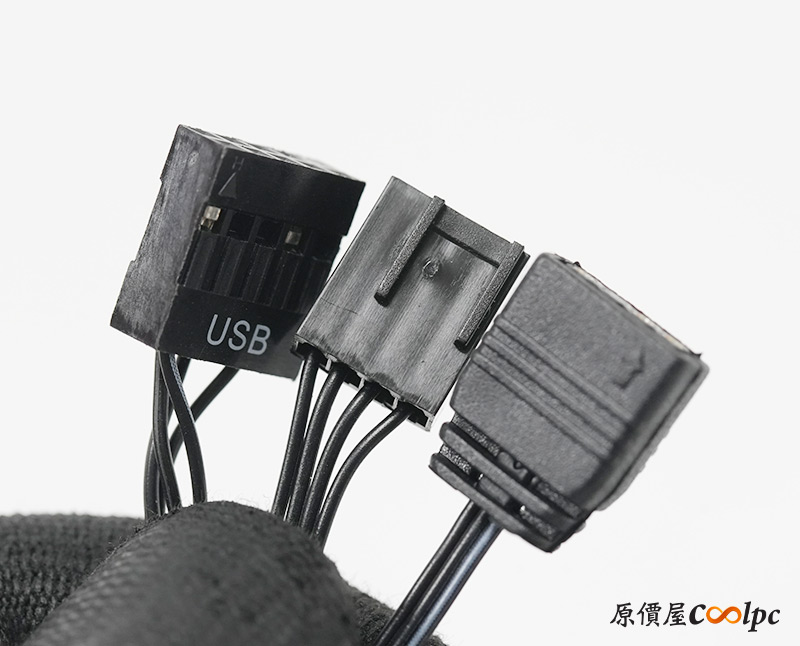 供電使用小4Pin介面,燈光是3Pin 5V RGB,數位面板則是USB 2.0 9pin。