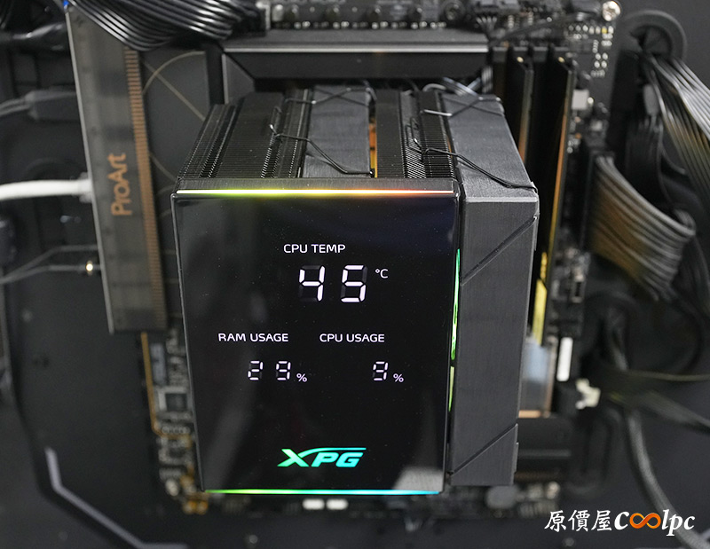 開機後要先到官網下載XPG PRIME軟體並開啟,否則散熱器上的數位面板不會有畫面喔。顯示的內容有CPU溫度、CPU使用率、RAM使用率,平時透過機殼玻璃側板就能直接看到運作狀況,並且面板上下兩側、XPG字樣、風扇都有ARGB燈效,透過主機板軟體就能和其他裝置同步。