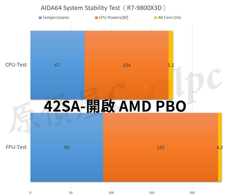 接著將散熱器換為XPG MAESTRO PLUS 42SA,測試平台維持不變,並使用 AIDA64 System Stability 進行 CPU/FPU 壓力測試。