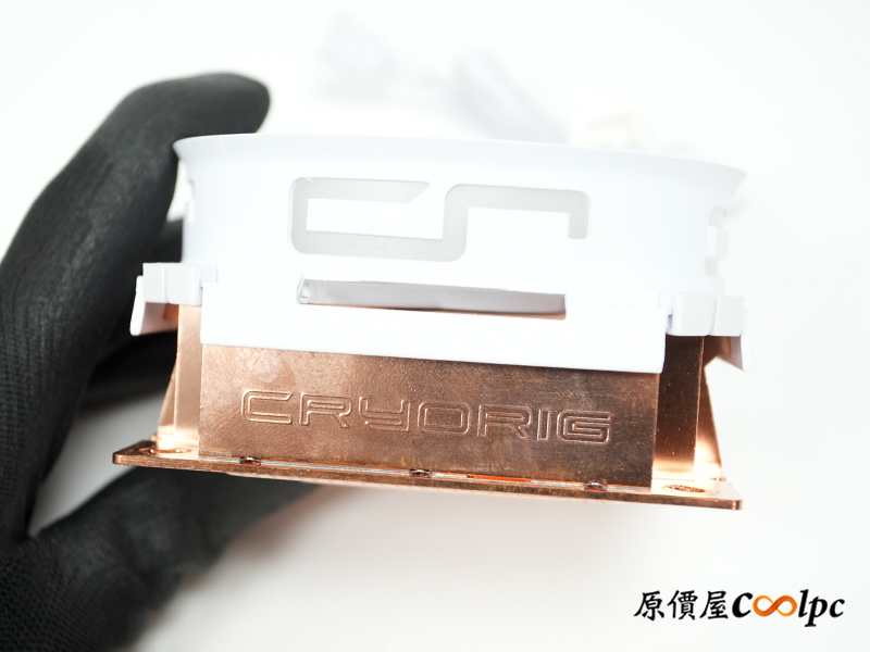 散熱器側面同樣保留了設計細節,可以看到 CRYORIG 全稱字樣以及品牌縮寫的 CR 標誌。