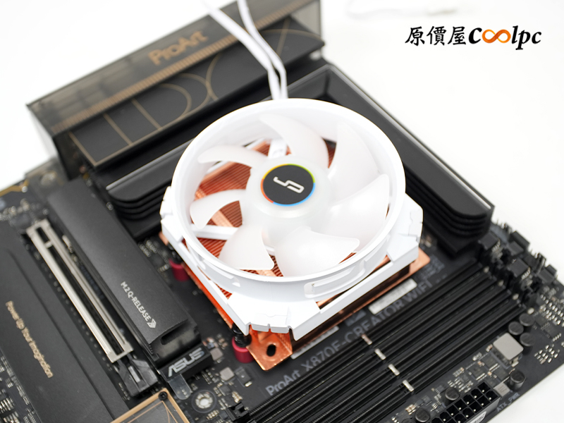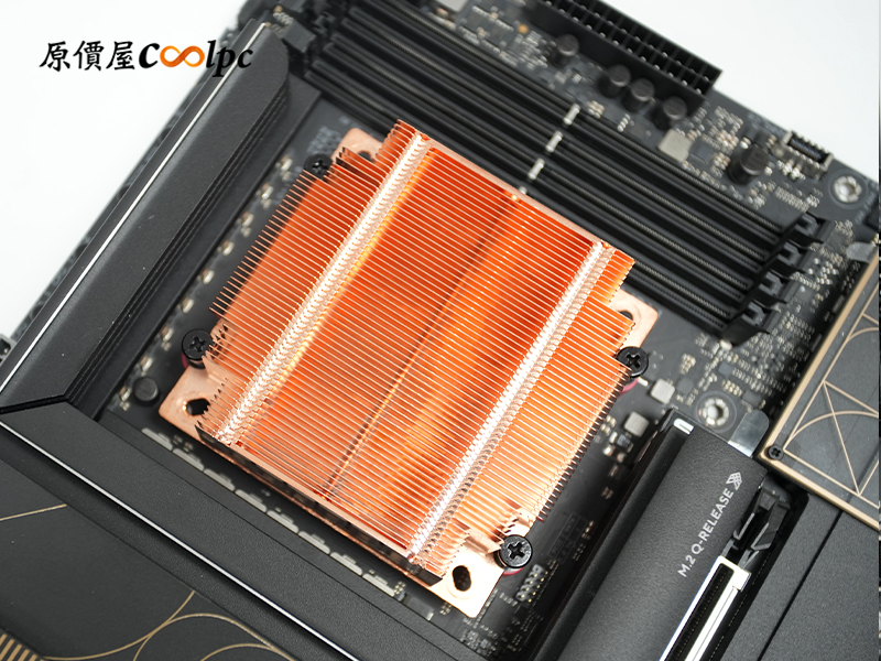 接下來看實際安裝的效果。可以看到散熱器本體相當精巧,僅涵蓋在 CPU 區域周圍,與旁邊的 MOS 散熱鎧甲及 M.2 散熱片之間都保有相當充裕的距離,完全不會產生干涉。