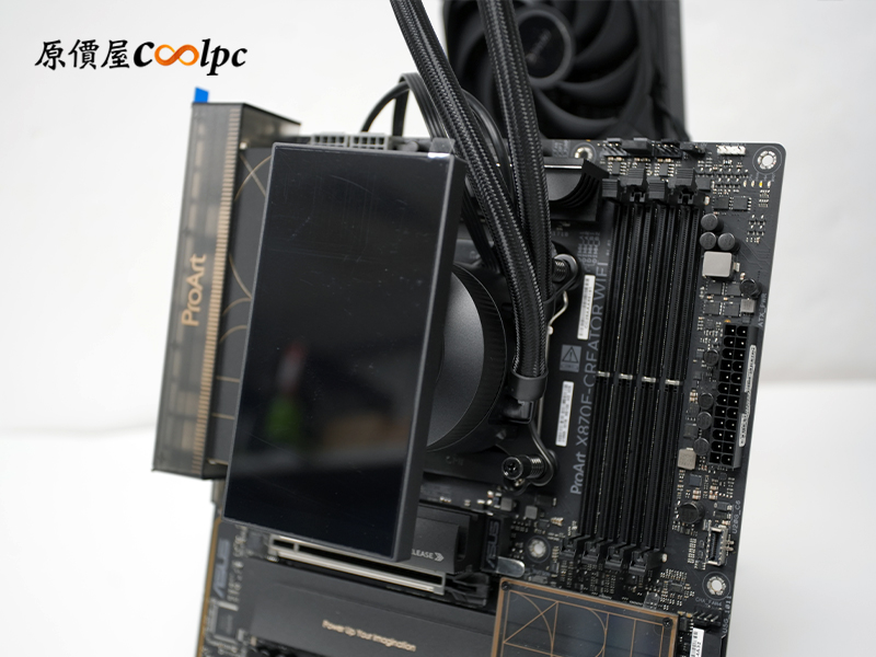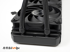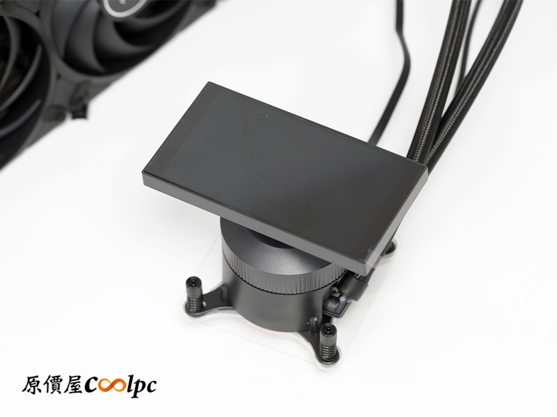 這組水冷最亮眼的絕對是頂部那塊 5 吋 IPS 螢幕!螢幕大到連下面的水冷頭本體都快被完全覆蓋了!雖然水冷頭本體相對嬌小,但這也帶來了不少好處,實際安裝也不怕會干擾到周邊零件;水管部分則用了編織線材包覆,柔軟度表現相當不錯,在機殼內調整走管角度時非常輕鬆順手。