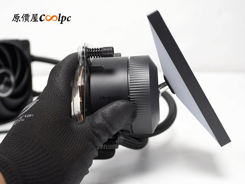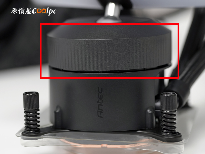 螢幕下方與水冷頭的連接處採用了獨特的球型關節設計,而且還貼心地加入了固定機關,完全不用擔心螢幕因為重量而下垂。這意味著玩家可以根據主機擺放的位置,隨意旋轉成橫式或直式,甚至微調觀賞角度都沒問題。在側邊可以看到精緻的 Antec 字樣點綴。