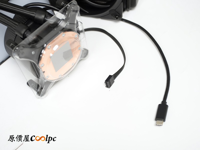 水冷頭延伸出兩條連接線,一條負責水泵電源供電,另一條則是 Type-C 傳輸線,專門用來驅動 5 吋大螢幕。