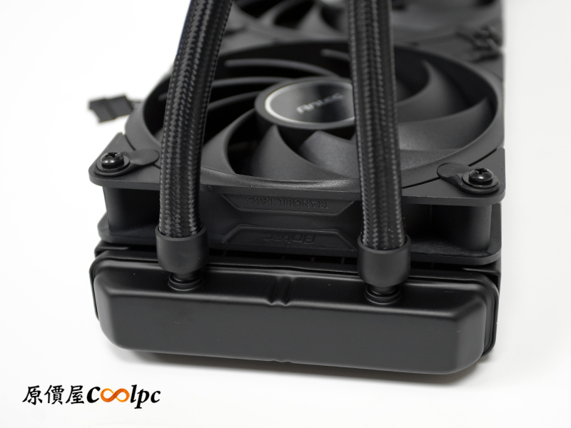 出廠時已預先把風扇裝在水冷排上了,幫玩家省下鎖螺絲的功夫。風扇框架與冷排側邊都能看到 Antec 的品牌字樣,細節質感做得不錯;這組風扇採用的是 FDB 液壓軸承,走的是無燈效的低調質感路線,轉速區間在 400 到 2000 RPM 之間,最大風量來到 59.23 CFM,風壓則是 2.46 mmH2O。雖然效能強勁,但噪音值僅 28.6 dBA,表現相當安靜,加上採用串接線材設計,讓整線變得更加輕鬆俐落。