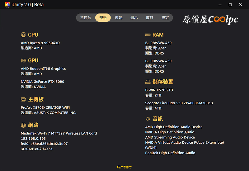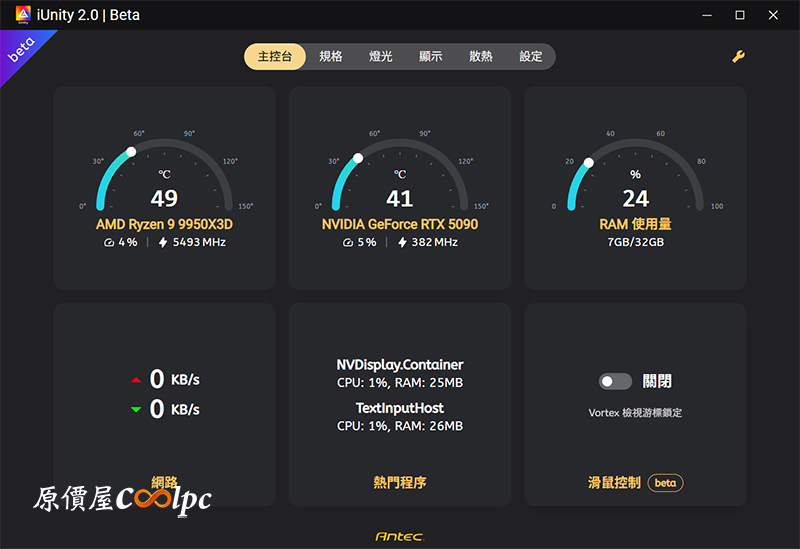 Antec 全新推出的 iUnity 2.0 雖然目前功能走簡約路線,也還沒支援各廠牌的 RGB 燈效同步,但大家的重點肯定都在那塊超吸睛的 5 吋大螢幕上(點我到官網下載)。在主控台介面可以一目了然 CPU、顯卡、記憶體、執行程序及網路狀態等資訊。另外要提醒大家,右下角的「Vortex 檢視游標鎖定」請務必把它勾選開啟,這樣才能避免滑鼠游標不小心跑進小螢幕裡唷!