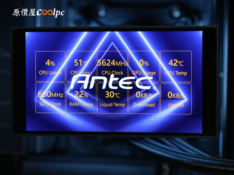 這次 Antec 推出的 Vortex View 360 水冷散熱器,最大亮點就是頂部那塊 5 吋 IPS 大螢幕!配合球型關節設計能隨意轉動角度,以及快要把水冷頭蓋住的大小,視覺效果絕對滿分!散熱部分採用第九代 ASETEK 幫浦方案,最高可以處理高達 400W TDP 的發熱量,這已經涵蓋了市面所有消費級 CPU 的需求了;專用 iUnity 2.0 軟體整合 Tenor GIF 搜尋功能,讓找圖變得超簡單,硬體監測介面也一目了然,甚至還貼心附上專用 USB 集線器,幫忙解決插槽不夠用的煩惱。雖說將近 12 公分的冷頭高度比較挑機殼空間,但換來的是完全不卡記憶體和散熱片的安裝體驗,不過對大部分玩家來說,重點肯定還是主機板上長了一塊大螢幕這件事,真的很酷啊!
