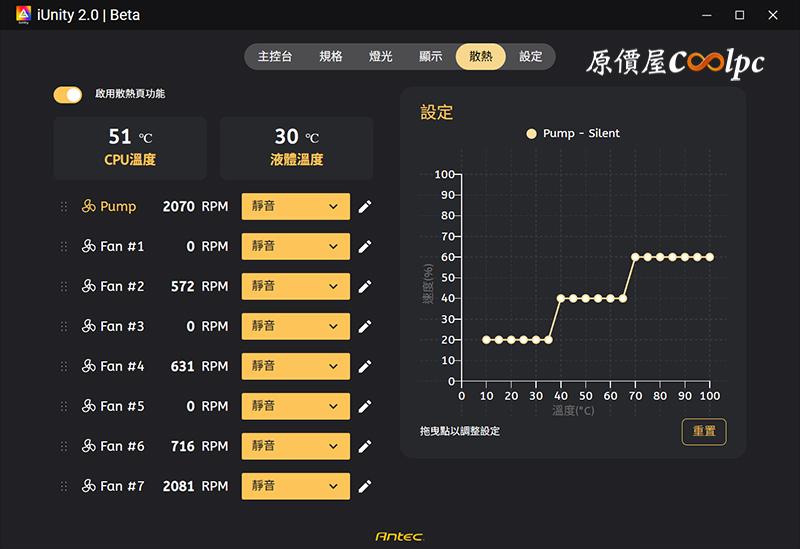 散熱面板可以直接自定義風扇的轉速曲線,根據需求手動調整溫度與轉速的對應關係,預設有靜音與效能兩種。