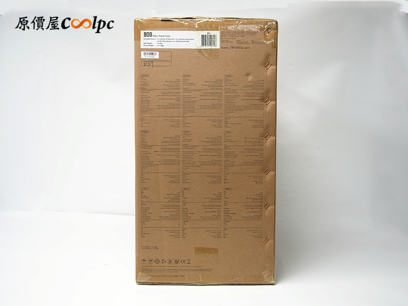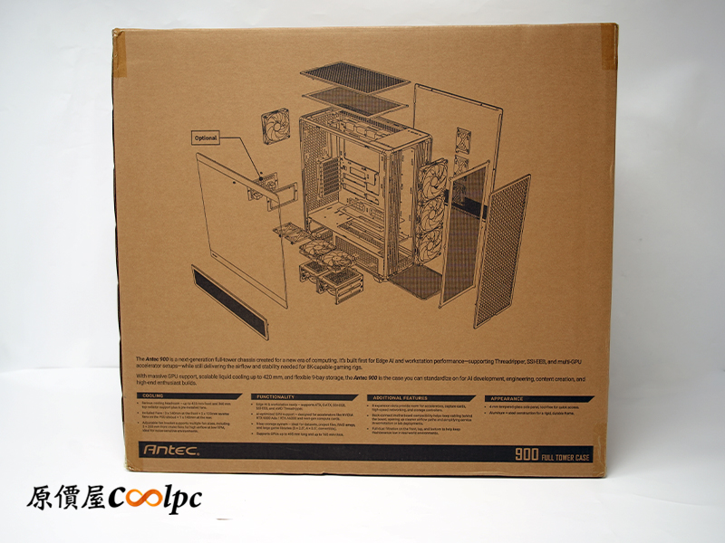 接著帶大家看 Antec 最新推出的全塔式 AI 工作站機殼 Antec 900!外箱採用樸實的素面紙箱,正面印有產品示意圖與型號,側面同樣準備了多國語言的特點介紹。轉到背面則是一張超大張的機殼爆炸圖,讓你一眼就能看透這款機殼極致方便的模組化設計。