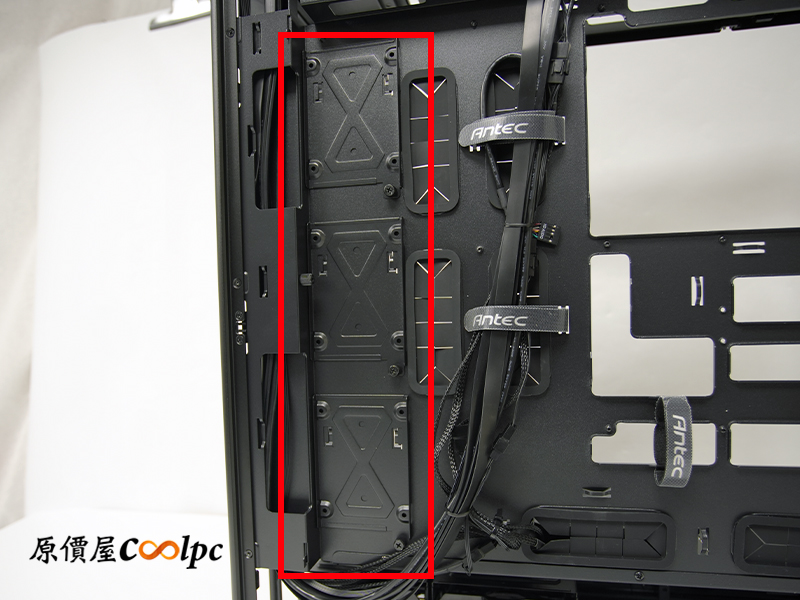 固定風扇的那兩根支架是可以自由調整位置的,支援 200mm*2、140mm*3、120mm*3 多種風扇組合。