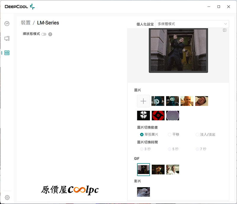回到 DeepCreative 軟體我還是介紹一下,軟體可以偵測基本的硬體資訊內容、狀態、使用量,最重要的是設定 DeepCool LM360 WH 水冷 2.4 吋 IPS 面板內容。
