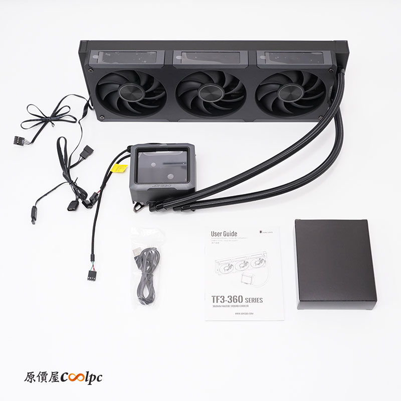 喬思伯 TF3-360SC 四螢幕一體式水冷,風扇採用一體式設計,為雙滾珠軸承,風量:21.46-62.40 CFM(each),轉速:700rpm~2400rpm(±10%),噪音:21.3-37.3 dB(A)(MAX);三顆風扇螢幕為磁吸式面板,尺寸為 3.38 英寸 IPS 面板,解析度 640*180 DPI,亮度 350 nits,可自訂 Gif/JPG/MP4 格式。
