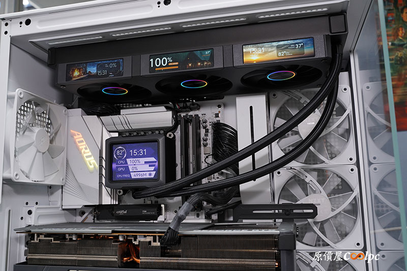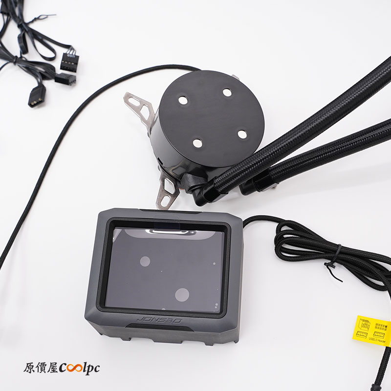 水泵上的螢幕為 3.5 吋 IPS 面板,解析度 640*480 DPI,亮度 350 nits,水泵轉速 2500 rpm (±10%),螢幕除了即時監控系統狀態之外,還能自訂 Gif/JPG/MP4 格式顯示在螢幕上。