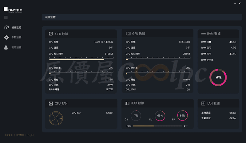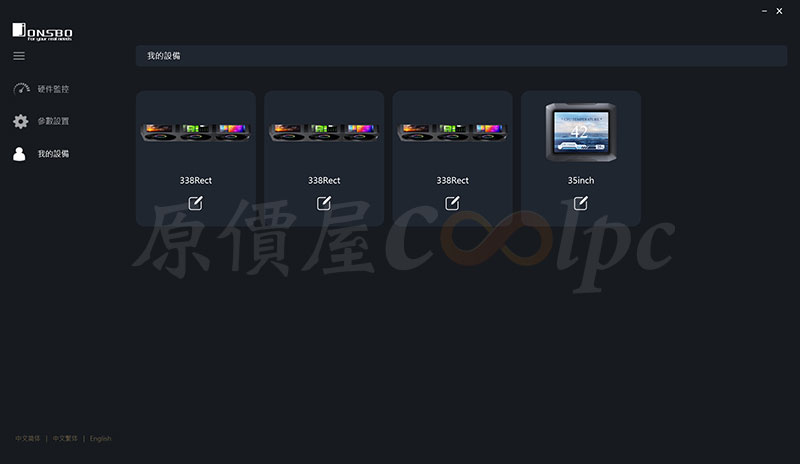 安裝完後進到軟體裡面有硬體監控、參數設置、我的設備,三個選單,要設定四個螢幕顯示要到我的設備裡面調整。