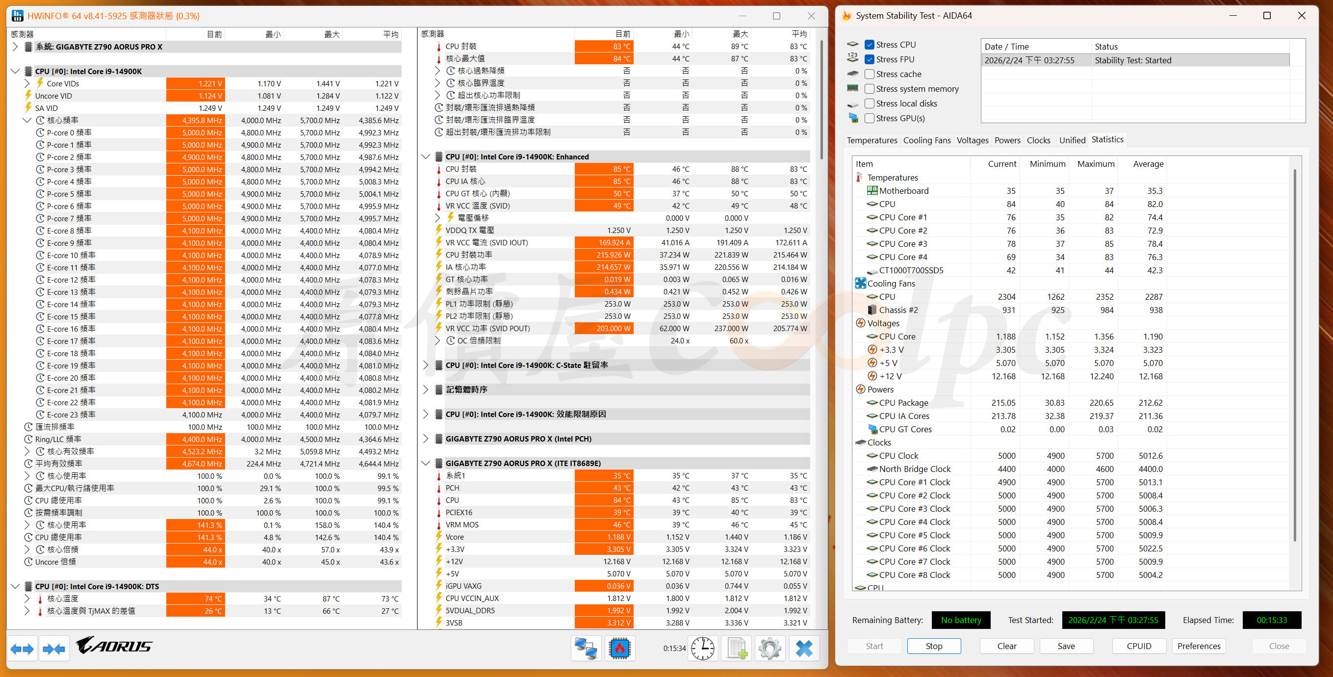 (點圖放大) BIOS Intel Default Settings Extreme 模式,一樣透過 AIDA64 測試軟體 15 分鐘,CPU 最大滿載約 253W,最高溫 97°C,核心時脈 P 核心 5.0~5.2 GHz,E 核心時脈 4.1~4.2 GHz,壓制能力相當不錯,CPU 253W 還有將近 5GHz 水準,溫度正常使用下不會完全都是跑滿載,不用擔心壓制不住頂級 Intel i9 或AMD Ryzen R9 處理器。