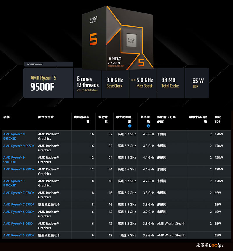 主流遊戲9威5!AMD Ryzen 5 9500F原價屋上市到貨!