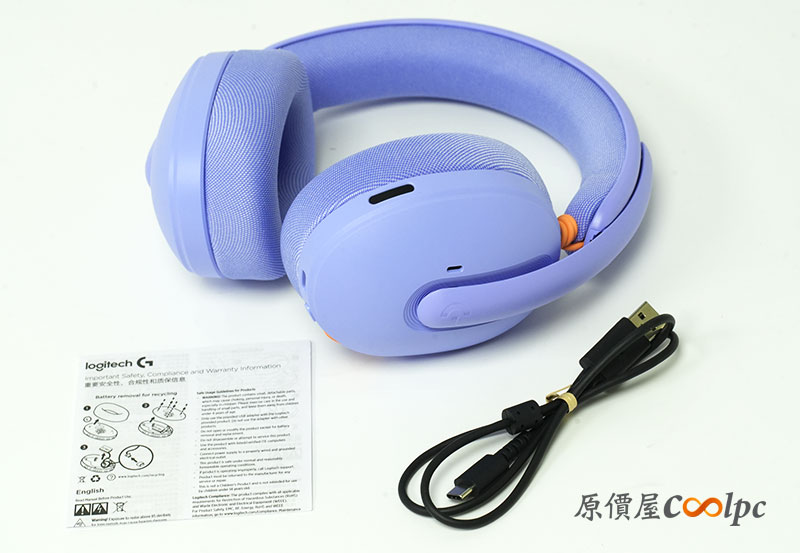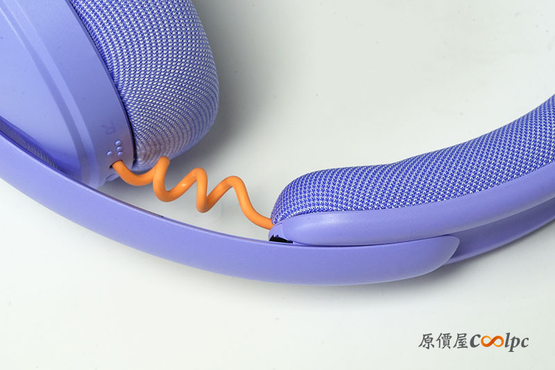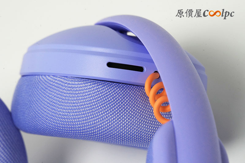 來看看耳機本體外觀。這次開箱我們以「丁香紫」款為主要。外型相當吸睛,搭配橘色細節點綴,整體更偏生活風格,不只電競也適合日常使用。
