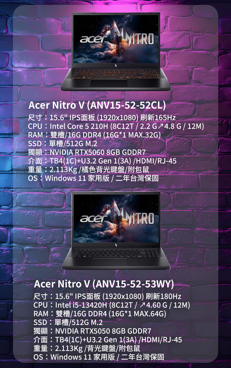 Acer Nitro V /Core 5-210H/RTX5060/16G/512G/15吋/黑 ANV15-52-52CL (蝦皮