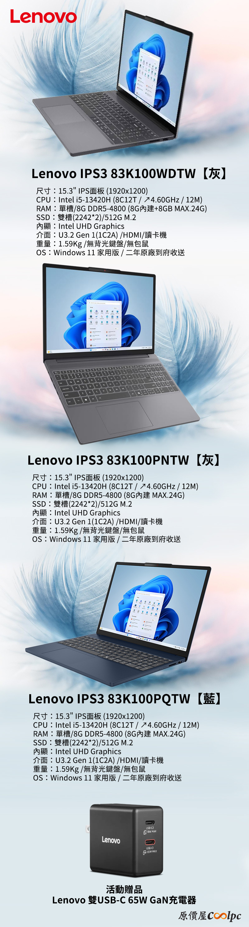 現在到原價屋買聯想Lenovo IPS3 83K100WDTW、IPS3 83K100PNTW、IPS3 83K100PQTW任一台,我們都額外送你一個雙USB-C 65W GaN氮化鎵充電器,不只是筆電夠輕盈,充電器也一併幫你減輕重量,而且有兩個USB-C孔可以同時充筆電與手機等其他裝置,在外使用都特別方便,有興趣的朋友不要錯過這檔囉!活動限時兩週售完為止喔。