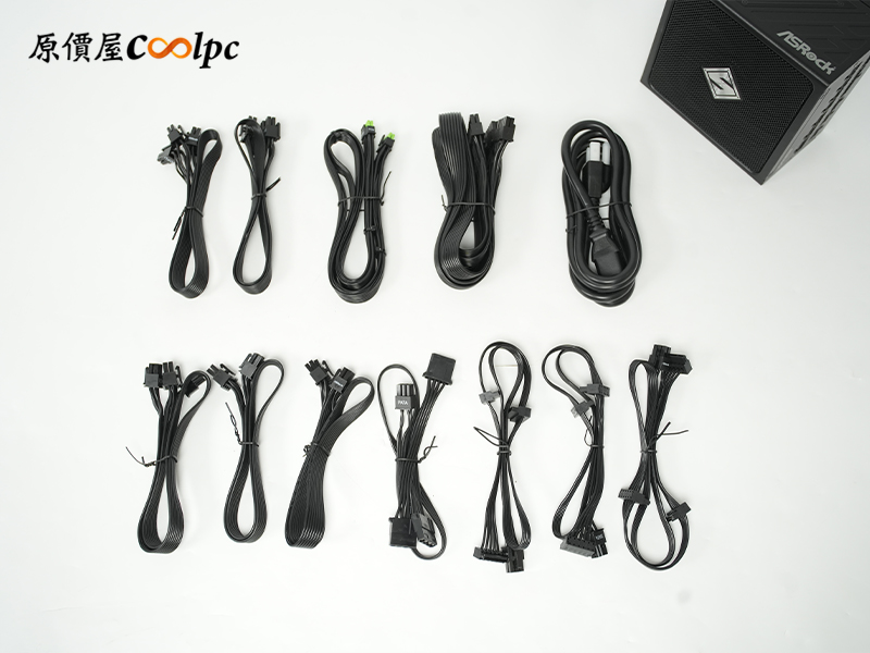 所有線材皆為扁平模組線設計,主板 20+4 Pin 長度 600mm,CPU 提供兩條 4+4 Pin(650mm),顯卡部分包含三條 PCIe 6+2 Pin 以及一條 PCIe 16 Pin(12V-2×6),完整支援新舊平台!