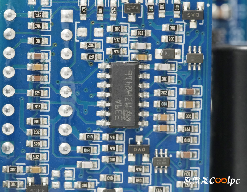 直接看模組化輸出端這邊,插槽功能都有標示加上防呆設計,看得出來12V-2×6有預留一個插槽空間,但猜測是因為這顆LEADEX III最多就850W輸出,多做也不會真的讓總輸出上升,看來只有更大瓦數的版本有機會用上它了。