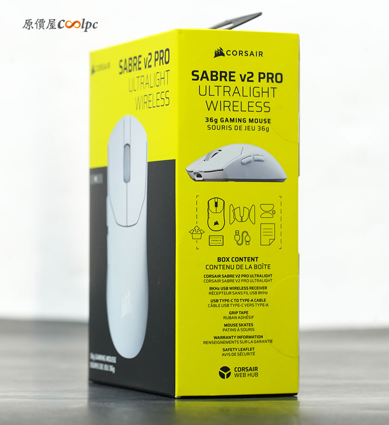 在競技遊戲的世界裡,速度與精準往往只差一瞬間,而這也正是 Corsair 海盜船打造「SABRE V2 Pro Ultralight」的核心理念。作為一款主打 FPS 電競玩家的無線滑鼠,本次開箱的白色版本不僅在外型上乾淨俐落,更在性能與重量之間取得極致平衡,帶來截然不同的操控體驗。最吸睛的莫過於它僅約 36g 的超輕量設計,幾乎已經逼近目前主流電競滑鼠的重量極限。搭配符合多種握法的對稱外型,在性能方面,「SABRE V2 Pro」搭載自家 MARKSMAN S 感應器,最高支援 33000 DPI,並具備高達 99.7% 的解析精準度,能精確捕捉每一個細微移動 。同時支援最高 8000Hz 的超高回報率(Hyper-Polling),讓滑鼠在無線狀態下依然擁有極低延遲的即時反應。續航表現同樣亮眼,最高可達約 70 小時的使用時間。更特別的是,透過瀏覽器即可使用 CORSAIR Web Hub 進行設定,省去安裝軟體的麻煩。整體而言「Corsair SABRE V2 Pro Ultralight 無線滑鼠」就是一款為極致輕量與競技性能而生的產品。從重量、規格到實戰表現,都明確鎖定追求速度與精準的玩家族群,也讓人相當期待它在實際遊戲中的表現!這回就和原價屋一起,來一起開箱這支海盜船的「Corsair SABRE V2 Pro Ultralight 無線滑鼠」吧!