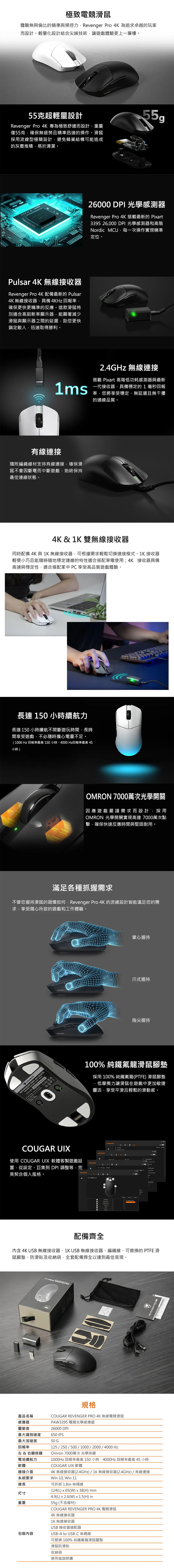 Cougar Revenger Pro 4K 無線滑鼠(黑/白)/26000Dpi/55g/4000Hz/隨附Pulsar 4K 無線接收器, $1990(蝦皮 開箱