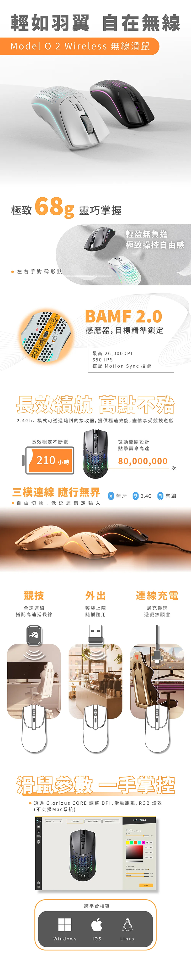 Glorious Model O2 Wireless 三模滑鼠(白)/有線/無線/藍牙/26000Dpi/68g/Rgb, $3890↘$1990