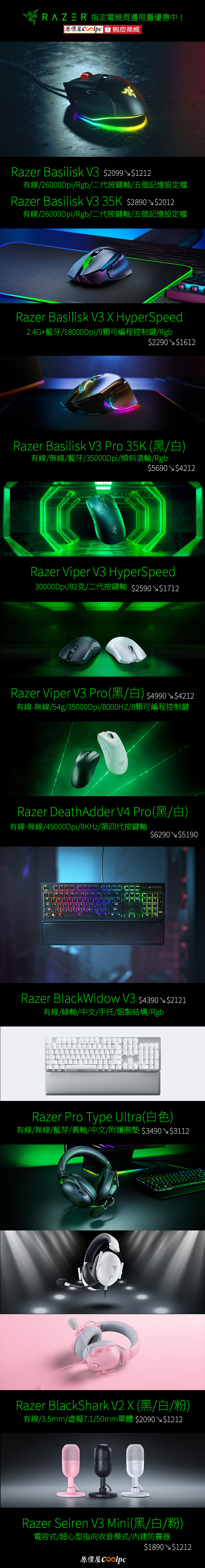 滑鼠、鍵盤、耳機、麥克風全到位!先說說這次的黃金價!只要 $1212 你就可以帶走信仰神物!如果你今年還沒完成裝備升級,那就鎖定這次 Razer 開大絕的超級優惠,價格低到連小編都想多買幾組回家囤貨!快來看看這檔到底有什麼超值的~首先亮出第一張王牌,高階規格的 Basilisk V3 原價兩千多,現在直接祭出…
