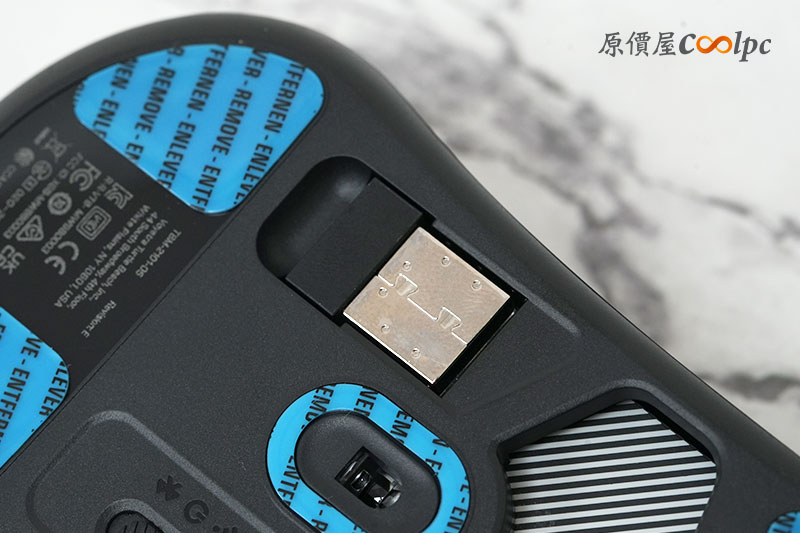 滑鼠底部採用 PTFE 腳貼,提供滑順移動體驗,並支援更換不同尺寸腳貼配置,讓玩家可依照滑動習慣調整手感。另外也有設置 USB 接收器的收納凹槽。