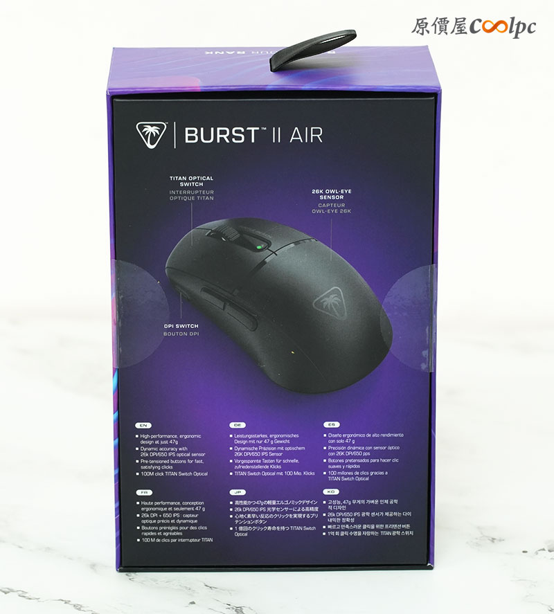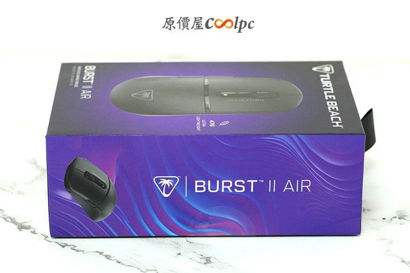 「Turtle Beach Burst II Air 輕量化三模無線電競滑鼠」的外盒採用紫黑色系設計,正面直接呈現滑鼠本體與產品名稱,整體風格走簡約科技感。側邊則標示重點規格,包含超輕量 47g、三模連線與高 DPI 感應器等特色,第一眼就能掌握產品定位。