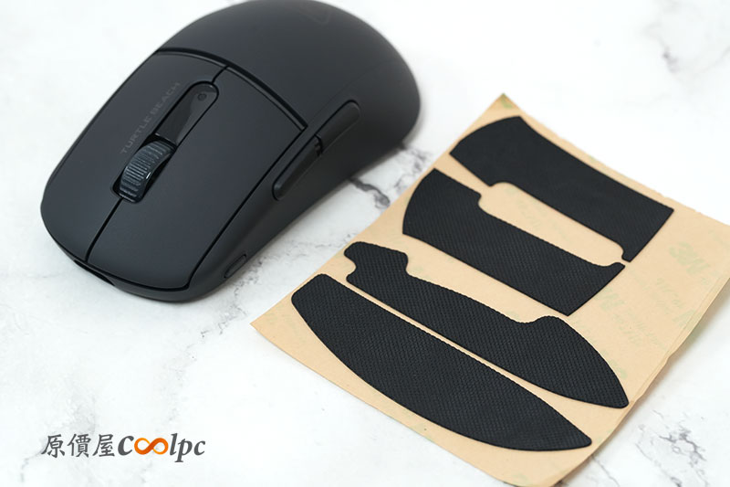 配件附上的替換式抓握墊、底部鼠腳。提升操控穩定度,對於手汗玩家或激烈操作情境相當有幫助。