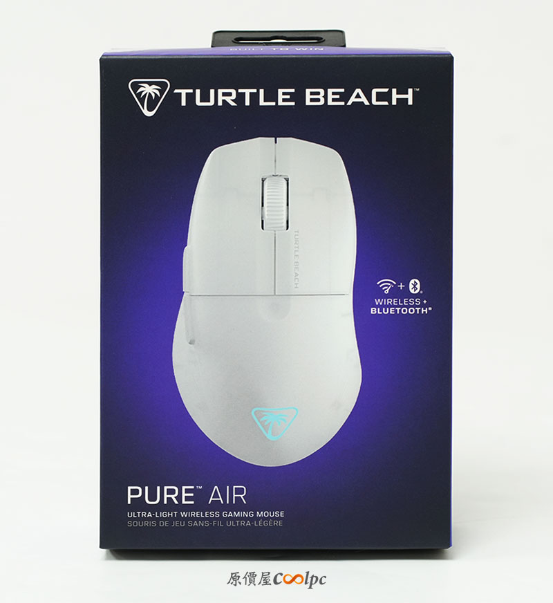 兩款的包裝均採用紫藍電競視覺呈現,正面清楚標示產品的名稱與功能特色,側邊也有搭載的技術與規格。而「Turtle Beach PURE AIR」是主打無線雙模 2.4GHz+藍芽的設計。