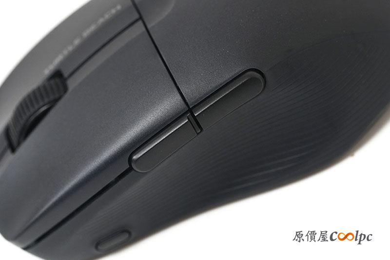 而滑鼠的 DPI 檔位調整,也是設計在滑鼠左側偏鼠頭的位置,這次相對少見的設計喔。