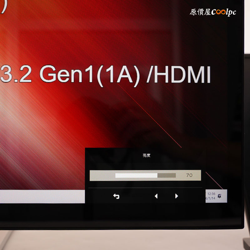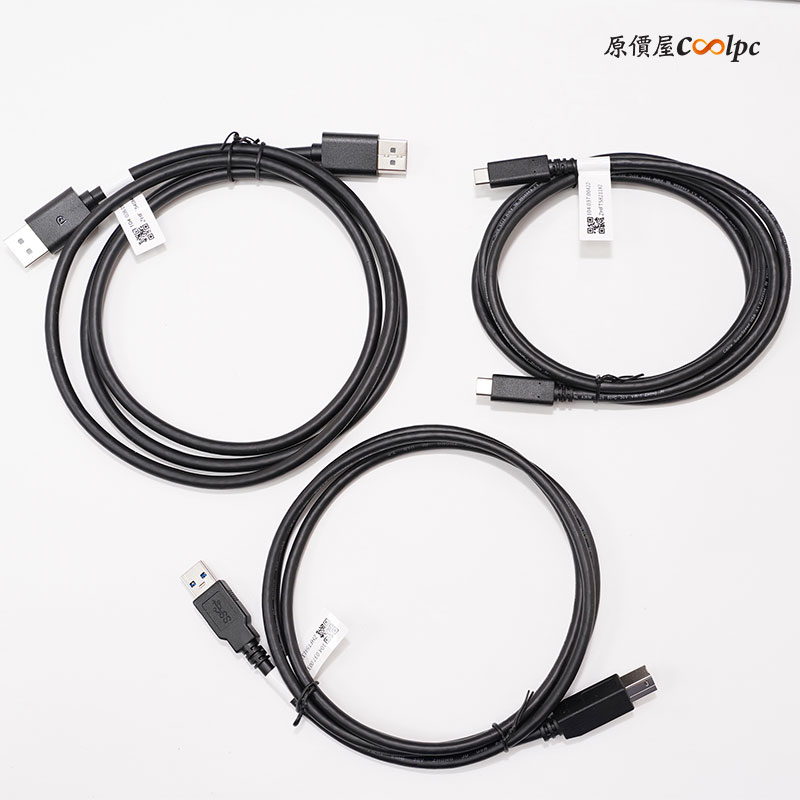I/O 設計在正後方,有 2 x USB3.2 Gen1、USB-B訊號傳輸線(HUB、觸控功能專用)、HDMI 2.1、Type-C (90W)、DisplayPort 1.4、Audio、和 DC 供電介面。