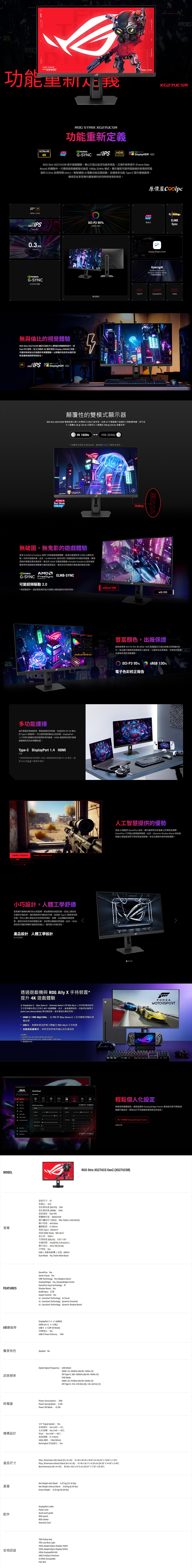 「策馬入林,勢不可擋,雙模戰力,一鍵解放」,ROG STRIX XG27UCSR搭載雙模技術,一台抵別人兩台,戰力馬上大升級!在4K UHD(3840 x 2160) 160Hz時,影像就如一幅畫般細膩,無論追劇、剪輯還是3A大作遊戲特效,每一絲細節都盡收眼底。若是換成FHD(1920 x 1080) 324Hz時,超高刷新率讓FPS遊戲畫面絲滑順暢,助你告別殘影精準狙擊。而且一鍵就能切換模式,你在戰場上就如同赤兔馬一樣靈活,在畫質與流暢度間變化自如。除了招牌的雙模式外,螢幕本身是功能全面的27″尺寸,選用FAST IPS面板,具備0.3 ms反應時間(min.),ELMB超低動態模糊,NVIDIA G-Sync、AMD FreeSync Premium抗撕裂,VRR可變更新率確保流暢同步的視覺效果。加上劇院級標準95% DCI-P3、130% sRGB色域,10.7億顯示色彩,還有VESA DisplayHDR 400高動態認證,低藍光不閃屏保護技術。遊戲輔助Gaming AI更沒少,藉由AI驅動GamePlus技術,提供Dynamic Crosshair動態準心提高瞄準精度,透過Dynamic Shadow Boost強化黑暗區域,讓你在戰場上佔盡優勢。I/O配備1x DisplayPort 1.4、1x HDMI 2.1、1x USB-C(DP Alt Mode),螢幕支架可以前後傾斜(-5°~+20°)、左右旋轉(±45°)、樞軸旋轉(±90°)、高低調整(0~110mm),支架上有1/4″螺紋麥克風安裝孔,也能搭配VESA 100x100mm規格螢幕支架使用。