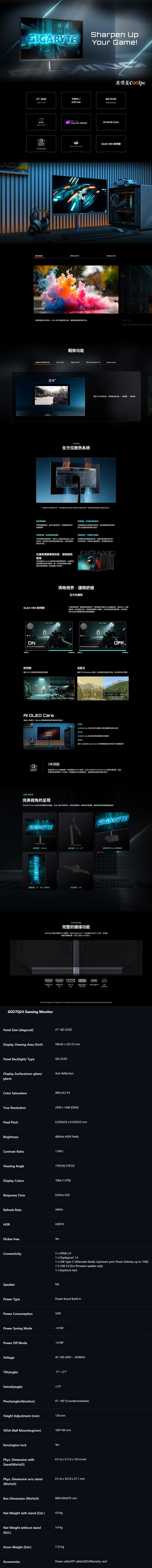 技嘉GO27Q24搭載QD-OLED面板,每個像素都是獨立發光,提供10.7B色深、99% DCI-P3廣色域的鮮明色彩,以及無盡的對比與最純粹的黑,遊戲特效氛圍感都更震撼。有著最適合遊戲的27″畫面、2K QHD(2560 x 1440)解析度、240Hz高刷新率、0.03ms極速反應時間(GTG),並通過VESA ClearMR 13000認證低動態模糊,還有OLED VRR防閃爍技術。遊戲中有專為FPS玩家打造的Tactical Switch 2功能,一鍵切換27″ / 24″、16:9 / 4:3畫面比例,Ultra Clear減少動態模糊,Night Vision夜視模式,Black Equalizer 2.0增加暗部細節,基本的計時器、虛擬準心、PIP/PBP子母畫面都沒少。I/O內建2x HDMI 2.0、1x DisplayPort 1.4、1x USB-C(Dp alt./ PD 15W)、1x USB 2.0(僅軟體更新用)、1x Earphone Jack,支架可以升降(130mm)、俯仰(-5°~+21°)、旋轉(0°~90°)、左右旋轉(±15°),螢幕也提供AI OLED保護技術,透過像素清理、像素位移、亮度控制、區域調光等方式防止烙印,並搭載特製散熱器、石墨烯薄膜導熱技術、最佳化散熱風道設計延長使用壽命,再享三年原廠保固。
