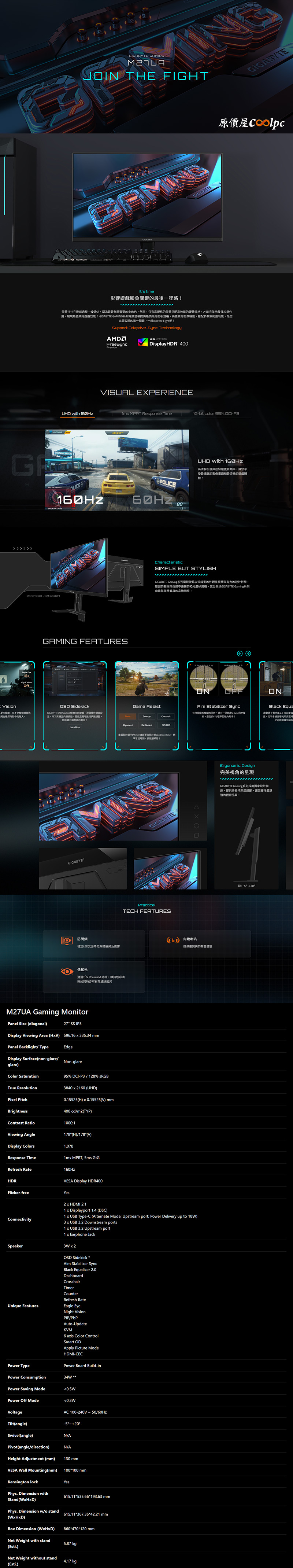 今年中秋節最香的不是烤肉,也不是月餅,更不是蛋黃酥,而是技嘉M27UA電競螢幕!27″ 4K UHD(3840 x 2160)解析度,SuperSpeed IPS面板,具備160Hz刷新率、1ms反應時間(MPRT)、10-bit色彩深度、95% DCI-P3 & 128% sRGB廣色域、FreeSync Premium Pro抗撕裂、HDMI2.1無損畫面,並通過VESA DisplayHDR 400高動態認證、TÜV Rheinland 低藍光認證,防閃屏技術也沒少。而且螢幕內建各式輔助功能,像是Night Vision、Aim Stabilizer Sync、Black Equalizer 2.0、Eagle Eye、虛擬準心、計時器等,玩遊戲內掛開滿,還有PiP/PbP顯示模式、KVM切換技術。I/O提供2x HDMI 2.1、1x DisplayPort 1.4、1x USB Type-C(DP Alt./USB上行/Power Delivery 18W)、3x USB 3.2(下行)、1x USB3.2(上行)、1x 耳機插孔、2x 3W喇叭。螢幕外型採簡潔的流線設計,低調啞光磨砂風格,原廠支架可以高低升降(130mm)、前後傾斜(-5°~+20°),使用起來更符合人體工學。最厲害的是本來要價$11990元的M27UA,直接殺到只要$6990元,都快砍到半價啦!這樣的價格你在別家絕對看不到,就連小編看了都心癢癢,有興趣的朋友趕緊到原價屋買起來,數量有限售完為止喔。