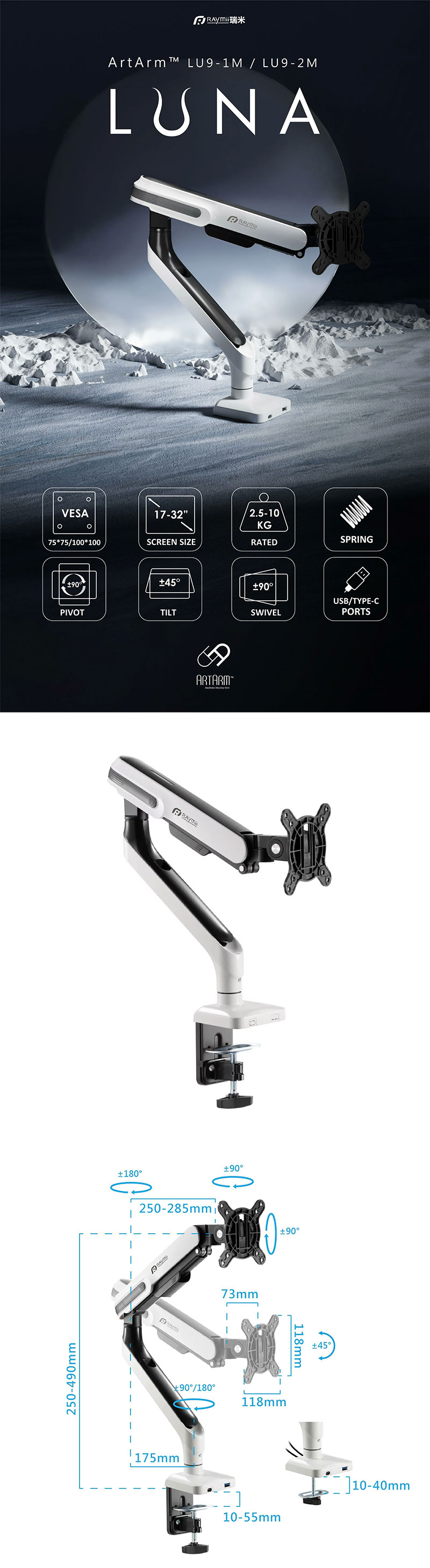 Raymii L-U9-1M (單螢幕/穿夾兩用/機械彈簧/承載10KG/17-32吋/USB3.0/TYPE-C) $2,000 送酷幣800