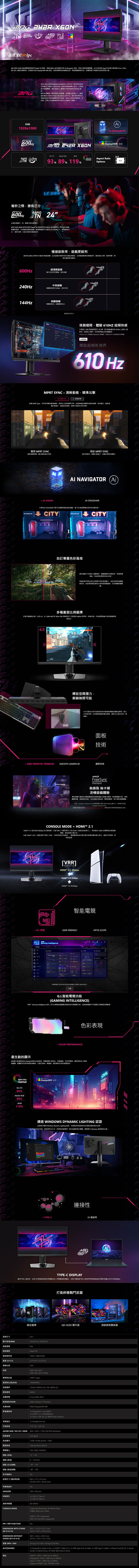 讓畫面達到前所未有的絲滑境界,享受零殘影的視覺盛宴,微星MSI MPG 242R X60N電競螢幕搭載驚人的600Hz畫面刷新率,無論是CS2的快速拉槍,還是Valorant的瞬移對決,對手的一舉一動都看得清清楚楚,讓你能第一時間作出反應,如同早已預見未來!配備電競選手首選的24″螢幕尺寸,反應速度最快的Rapid TN面板,解析度FHD(1920 x 1080),並透過MPRT Sync大幅減少動態模糊,AMD FreeSync Premium抗撕裂卡頓,AI VISION看清暗部細節,AI CROSSHAIR 智能準心輔助瞄準,不讓你錯失任何目標。另外提供多畫面比例支援,包括老玩家習慣的4:3,1280 x 960、1024 x768解析度也能達到600Hz更新率,自由選擇自己適合的設定。色彩方面相較傳統TN電競螢幕也更出色,包含93% DCI-P3、119% sRGB、VESA DisplayHDR 400高動態認證。還加入實用的KVM切換功能,Gaming Intelligence APP輕鬆校調顯示設定,螢幕背面內建MYSTIC LIGHT環境燈光,I/O配備1x DisplayPort 1.4a (HBR3)、2x HDMI™ 2.1 (FHD@600Hz)、1x Type-C (DP alt. / 98W PD)、3x USB 2.0(Type-A)、1x USB 2.0(Type-B)、1x Earphone jack。